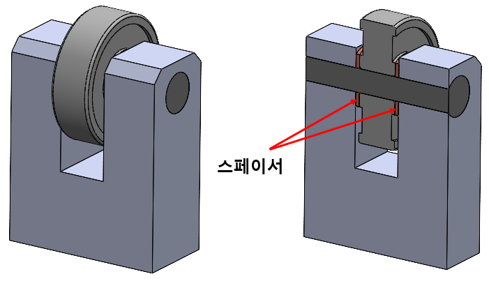 베어링 내륜 양쪽에 스페이서를 삽입하여 'ㄷ'자 외부 블록에 베어링 내륜이 스페이서를 통해 접촉되어 있고, 외륜은 접촉되어 있지 않아 원활한 회전이 가능하다.
