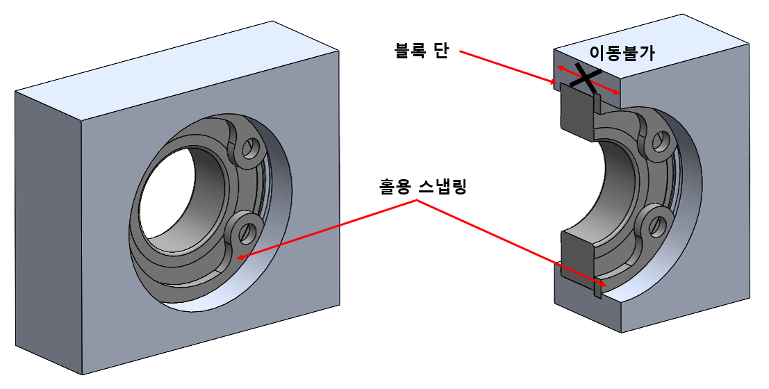 베어링이 블록 내부에 들어가는 경우로 블록 단이 외륜의 한 쪽과 접촉, 다른 한 쪽은 홀용 스냅링과 접촉하여 베어링 이탈을 방지시킨다. 이렇게 하면 외륜만 접촉되어 있기 때문에 원활한 내륜 회전이 가능하다.