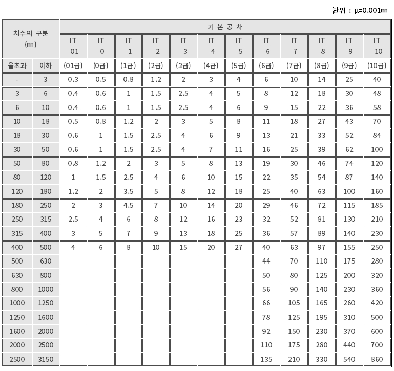 IT공차 등급 : 알파벳 문자 뒤에 숫자는 IT공차 등급을 의미하며, IT공차 등급의 숫자가 낮을수록 공차의 정밀도가 높아진다.