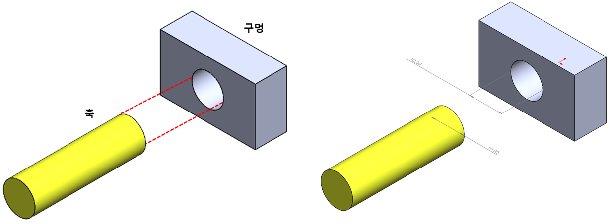 - 구멍 : 안쪽 면을 가지고 있는 형상, 끼워질 때 구멍의 안쪽면이 축의 바깥쪽면과 접촉