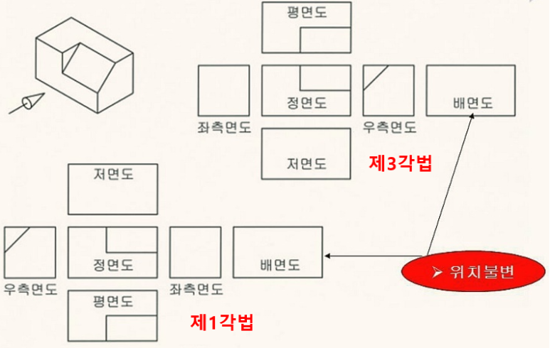 각각의 방향에서 바라본 물체의 모양은 정면도를 기준으로 하여 배열하게 된다. 투상하는 원리는 제1각법과 제3각법에 따라 서로 다른 위치에 배열하게 되는데, 제1각, 제3각 모두 배면도의 위치는 가장 오른쪽에 배열한다.