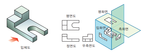 물체의 형상, 기능 등을 가장 정확하고 뚜렷하게 나타낼 수 있는 방향에서 그린 그림을 정면도라고 하며, 정면도를 기준으로 물체를 보는 방향에 따라 투상도를 그린다.