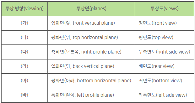 정투상법은 밑의 그림과 같이 6개의 투상면을 생각할 수 있다.