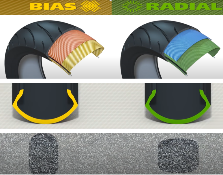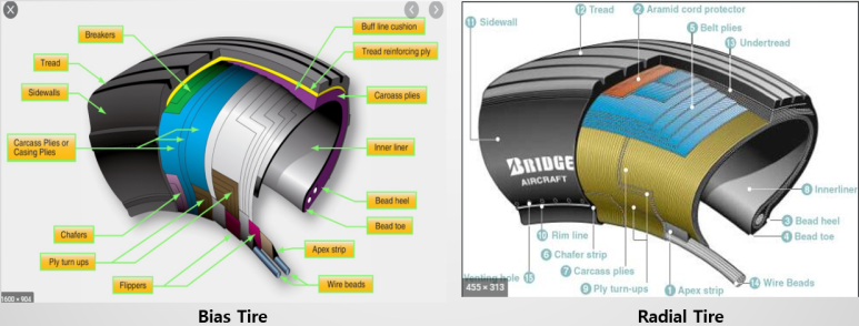 - Bias Tire : 전통적 타이어, 45도 전후 사선 cord가 서로 대각선으로 여러층으로 구성무게↑, sidewall 두꺼움(충격흡수성↓), service life↓