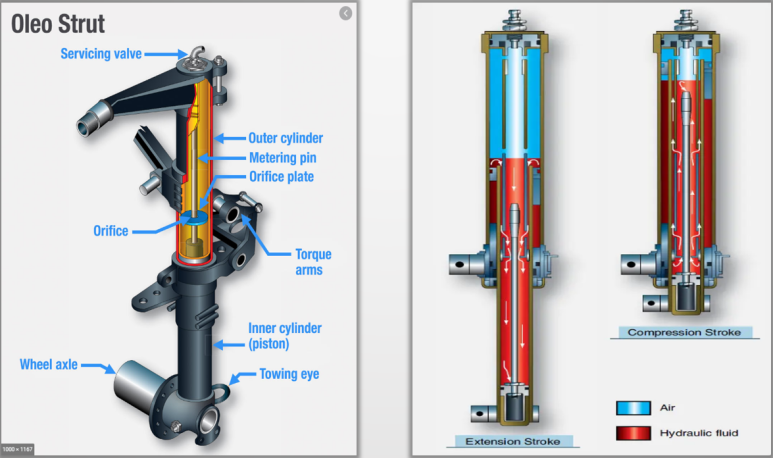 | 작동원리 | - 항공기 착륙 시 하부실린더 작동유가 미터링핀과 오리피스 통과하면서 발생하는 마찰과 저항으로 충격흡수(1차흡수), 올라간 작동유가 상부실린더에 있는 질소를 압축하고 압축 한 질소가 다시 팽창하면서 충격흡수(2차흡수) |