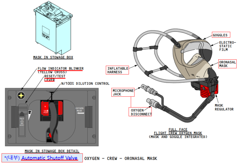 - Stowage Box 안에 Oxygen Mask 보관, Stowage Box 안 automatic shutoff v/v