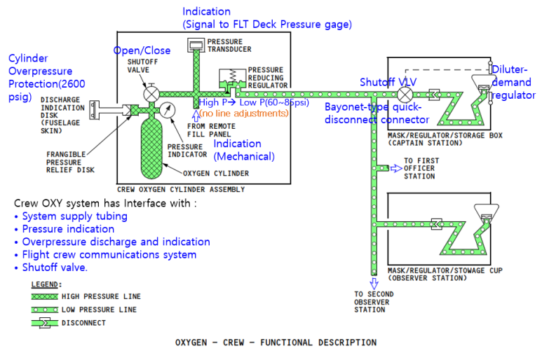 - Crew Oxygen Cylinder : E/E Compartment 우측, 1850psi(70도F), 접근은 FWD CGO