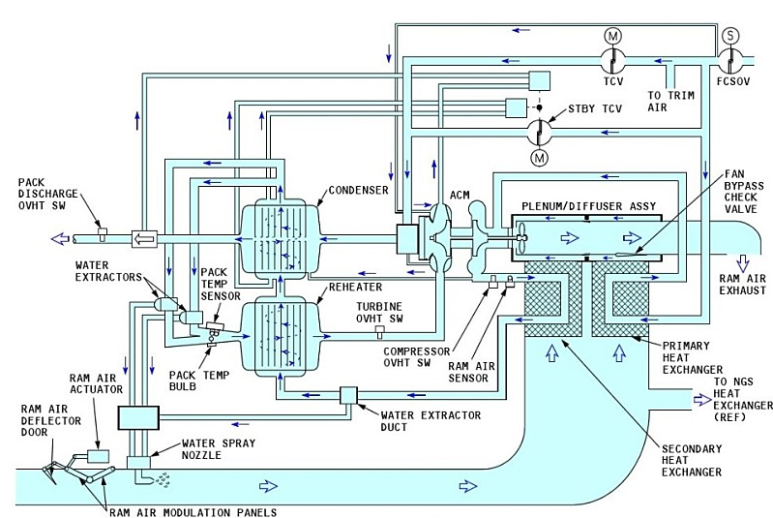 ENG bleed air → Pack V/V(FCSOV) → TCV or SBTCV → Turbine outlet에 유저로 나가는 Temp control → Primary Heat Exchanger(Ram air를 통해 bleed air 냉각) → 압축기 → Secondary Heat Exchanger → Water Extractor Duct → Reheater → Condenser → Water Separator → Reheater → Turbine → Condenser → Mix manifold(Mixer) → FLT COMP(Cockpit), AFT Cabin, FWD Cabin에 공급