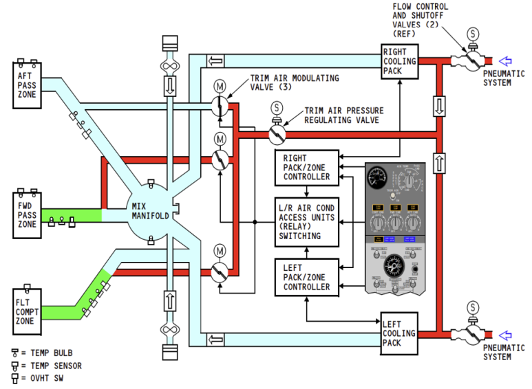 2. pneumatic system → Pack V/V(FCSOV) → Trim air pressure regulating V/V → Trim air modulating V/V → Mix manifold → FLT COMP(Cockpit), AFT Cabin, FWD Cabin에 공급