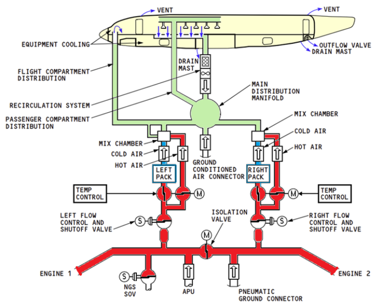 - Mix manifold(Mixer) : 4곳에서 air가 들어옴(ENG1, ENG2, GRD AC CONN, Cabin에 들어간 air가 수직으로 다시 들어옴)