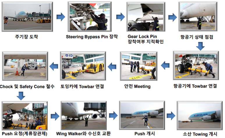 - Pushback Towing : Parking된 곳에서 taxiway까지 Towing, 이 Towing은 ENG이 돌 수도 있고 아닐 수도 있음