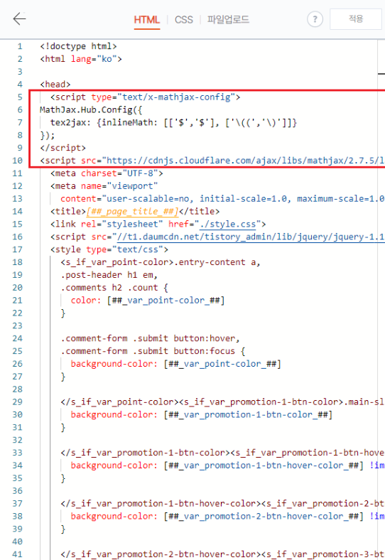 티스토리에 LaTeX를 이용하여 수식을 삽입할 때 사용하는 코드는 밑의 코드와 같다.
