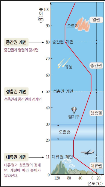 - 성층권 계면 : 중간권과 열권의 경계면이며 기온이 가장 낮음