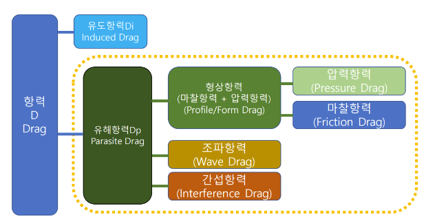 ※ 전항력(Total Drag) = 유해항력(형상항력+조파항력+간섭항력) + 유도항력
