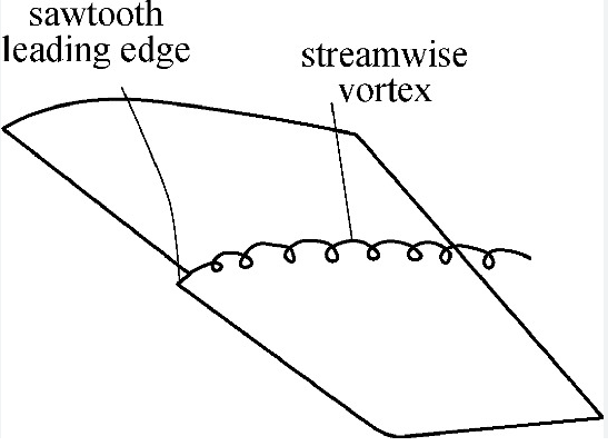3. 톱날 앞전 형태(sawtooth leading edge) : 바깥쪽 날개는 앞쪽 날개보다 앞쪽으로 당겨 설치 → 스팬방향으로 압력차이 제거