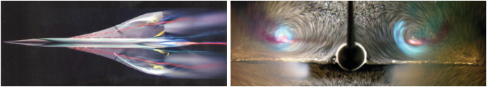 - 원추와동은 압력이 매우 낮아 주변의 수증기를 응축 → 응축된 수증기 발생 → 전투기의 경우, 원추 와동 양력을 발생시키기 위해 앞전 스트레이크(L/E strake) 부착