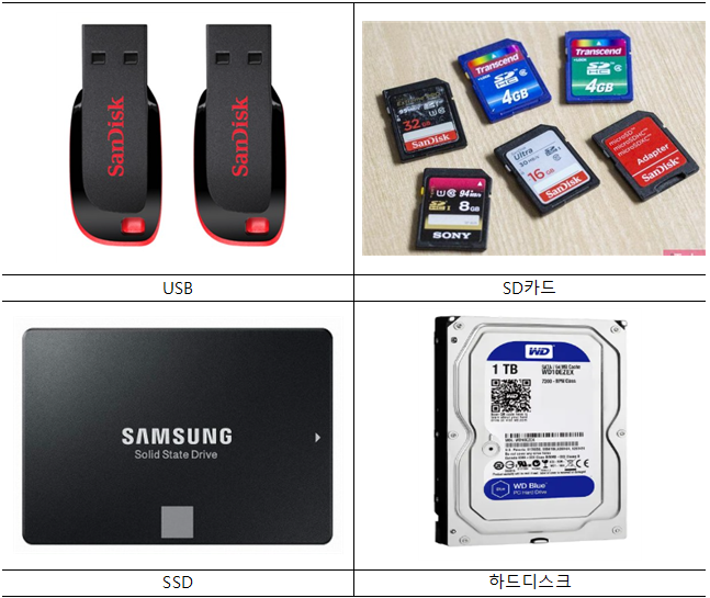 USB, SD카드, CD-ROM, 하드디스크, SSD 등이 보조기억장치이다. RAM은 보조기억장치에 비해 비싸다. 그리고 전원이 꺼지면 저장된 내용을 잃는다. 메모리는 실행되는 프로그램의 명령어와 데이터를 저장하는데 의의가 있다면, 보조기억장치는 전원이 꺼져도 저장이 가능하다는 점에서 의의가 있다. 보조기억장치는 일반적으로 용량이 크고 값도 싸다.