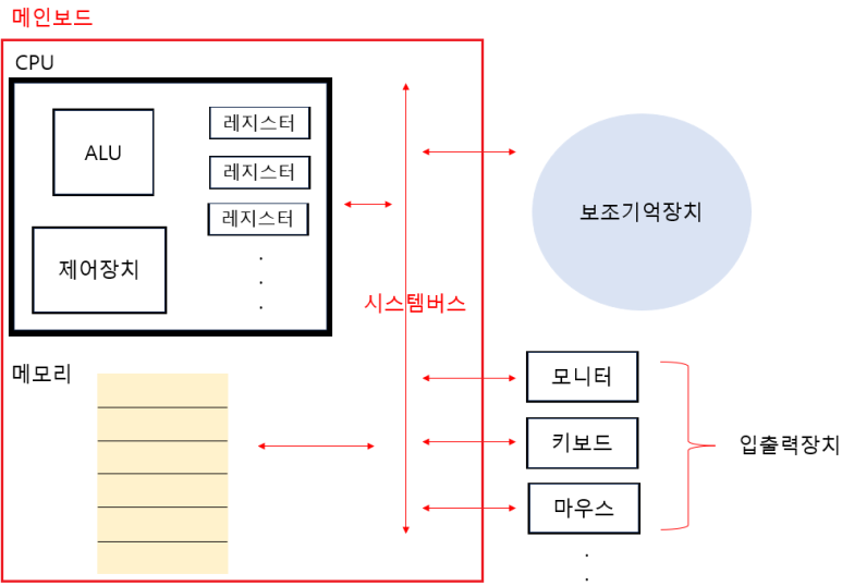 - 레지스터 : CPU 내부의 작은 저장장치, CPU 내부에 여러 개가 존재함