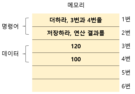 - 명령어 : 컴퓨터를 실질적으로 움직이는 정보, 데이터는 명령어를 위한 일종의 재료