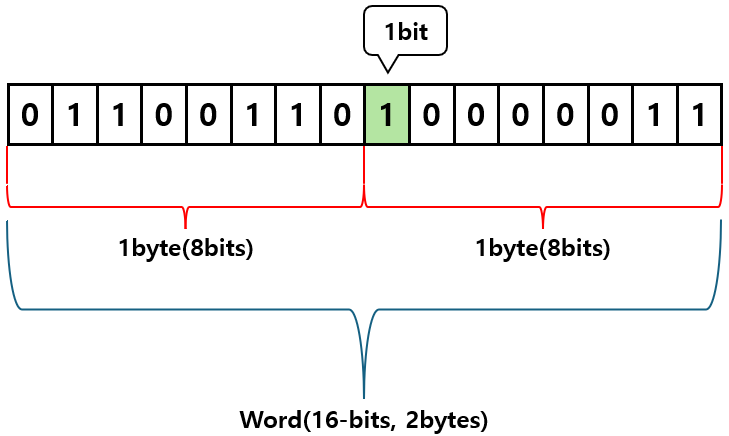 사람 간의 대화에서 언어가 필요하듯, PC와 사람 간의 대화를 위해 약속된 언어가 필요하다. 그 언어를 2진수(binary) 또는 Bit(비트) 라고 한다. 비트란 0과 1의 정보를 나타내는 최소 단위이다. 0과 1을 표현하는 1비트는 0 또는 1인 숫자 여덟 개를 모아 표시할 수 있는데, 이 단위를 바이트라고 한다. 8비트가 모이면 1바이트가 된다.(8Bit == 1Byte) 1바이트는 0부터 255까지의 값을 가질 수 있게 된다.