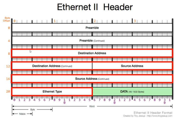 Ethernet 프로토콜은 LAN에서 통신할 때 사용하는 프로토콜로 총 14바이트로 Destination Address, Source Address, Ethernet Type으로 구성되어 있다. 목적지 MAC 주소 6바이트, 출발지 MAC 주소 6바이트, 나머지 Eternet Type 2바이트가 들어간다.