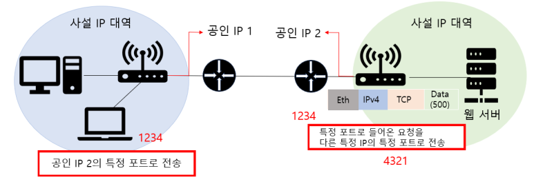 특정 포트로 들어온 요청을 내부 네트워크 대역 중 특정 IP의 특정 포트로 전송한다.