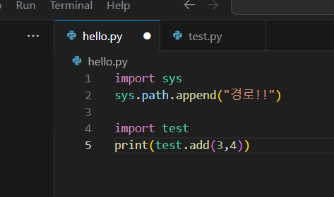 같은 경로에 있는 파일은 바로 import 할 수 있다. 현재 hello.py와 test.py는 같은 경로에 있다. 하지만 경로가 다른 경우 path를 추가해주어야 한다.
