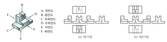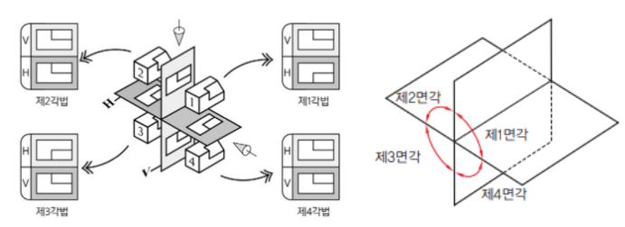 직교하는 두 평면을 투상면으로 하여 4면각으로 나누고 어느 한 투상면에 물체를 넣고 투상을 한다. 일반적으로 물체를 제1상한과 제3상한에 놓고 투상하여 표시하고, 제1상한을 제1각법, 제3상한을 제3각법이라 한다.